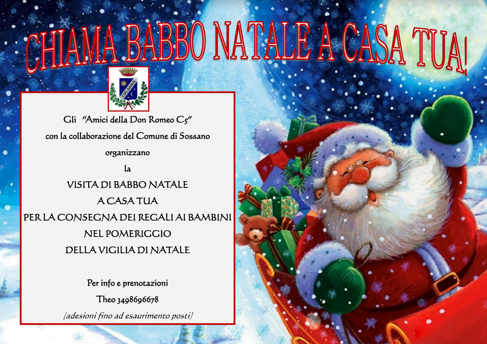 L'Associazione "Amici della Don Romeo C5", in collaborazione con il Comune di Sossano, organizza la visita di Babbo Natale a casa di tutti i bambini con la consegna dei regali martedì 24 dicembre 2025.