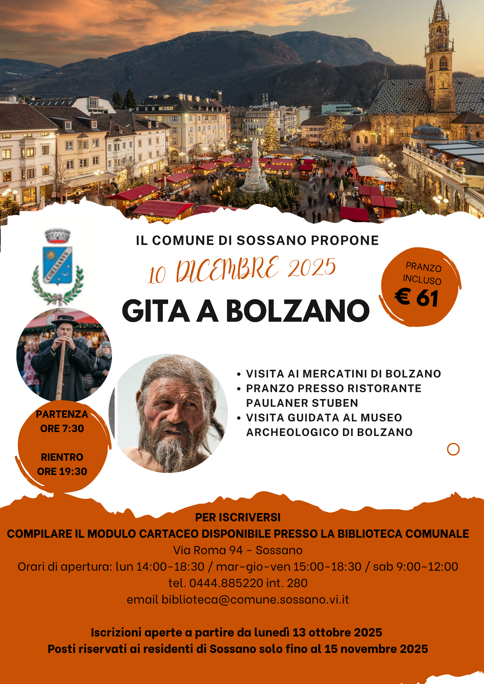 Il Comune di Sossano organizza una gita a Bolzano per mercoledì 10 dicembre 2025, con un ricco programma che unisce cultura, tradizione e atmosfera natalizia.
