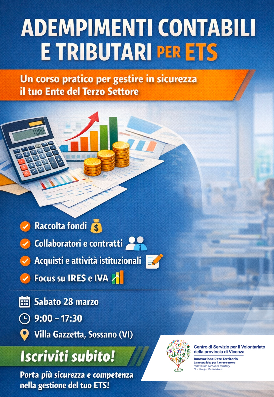 Il Comune di Sossano, in collaborazione con il Centro Servizi Volontariato di Vicenza, invita tutte le Associazioni e gli Enti del Terzo Settore (ETS) del territorio a un importante appuntamento formativo dedicato alla gestione contabile e tributaria.