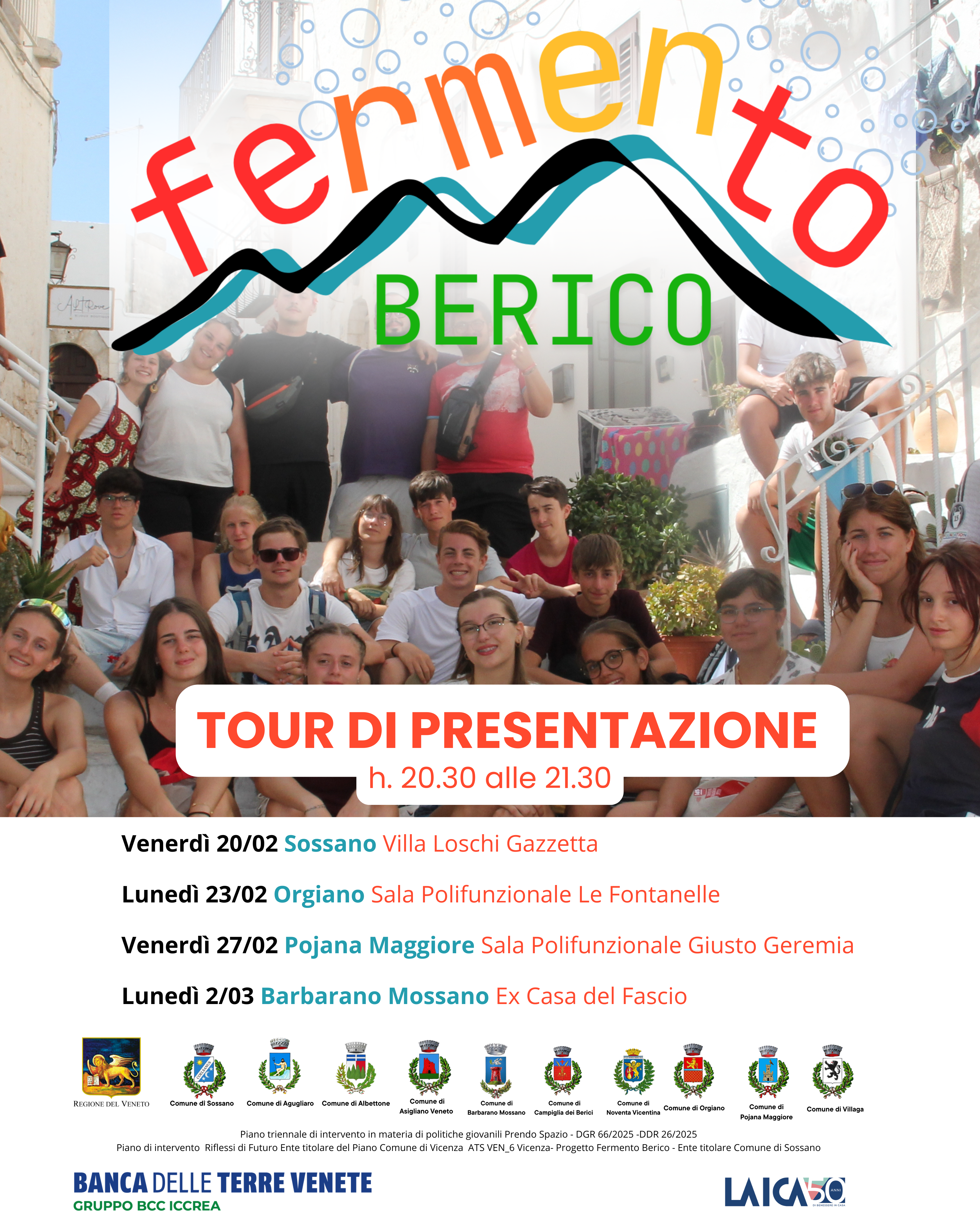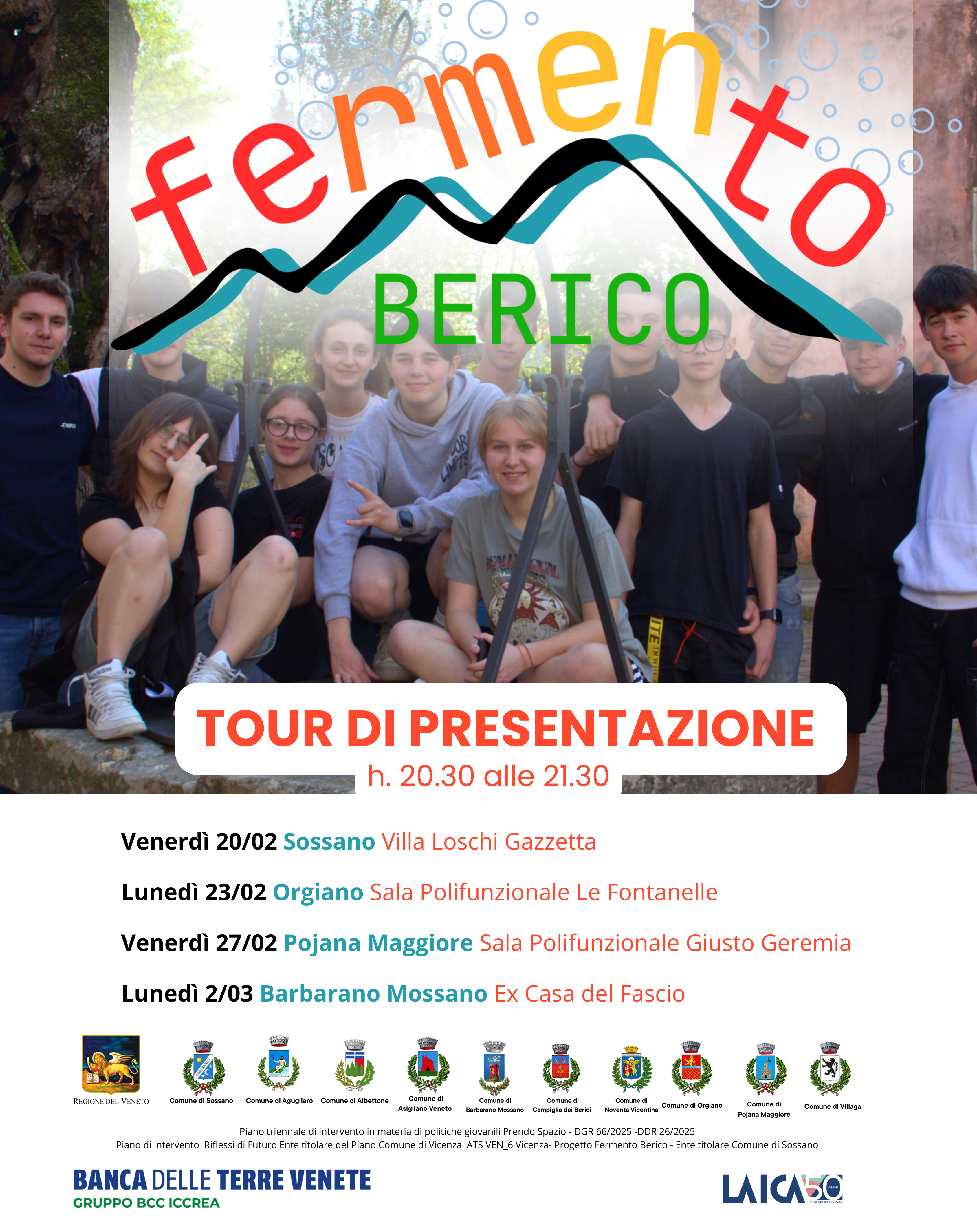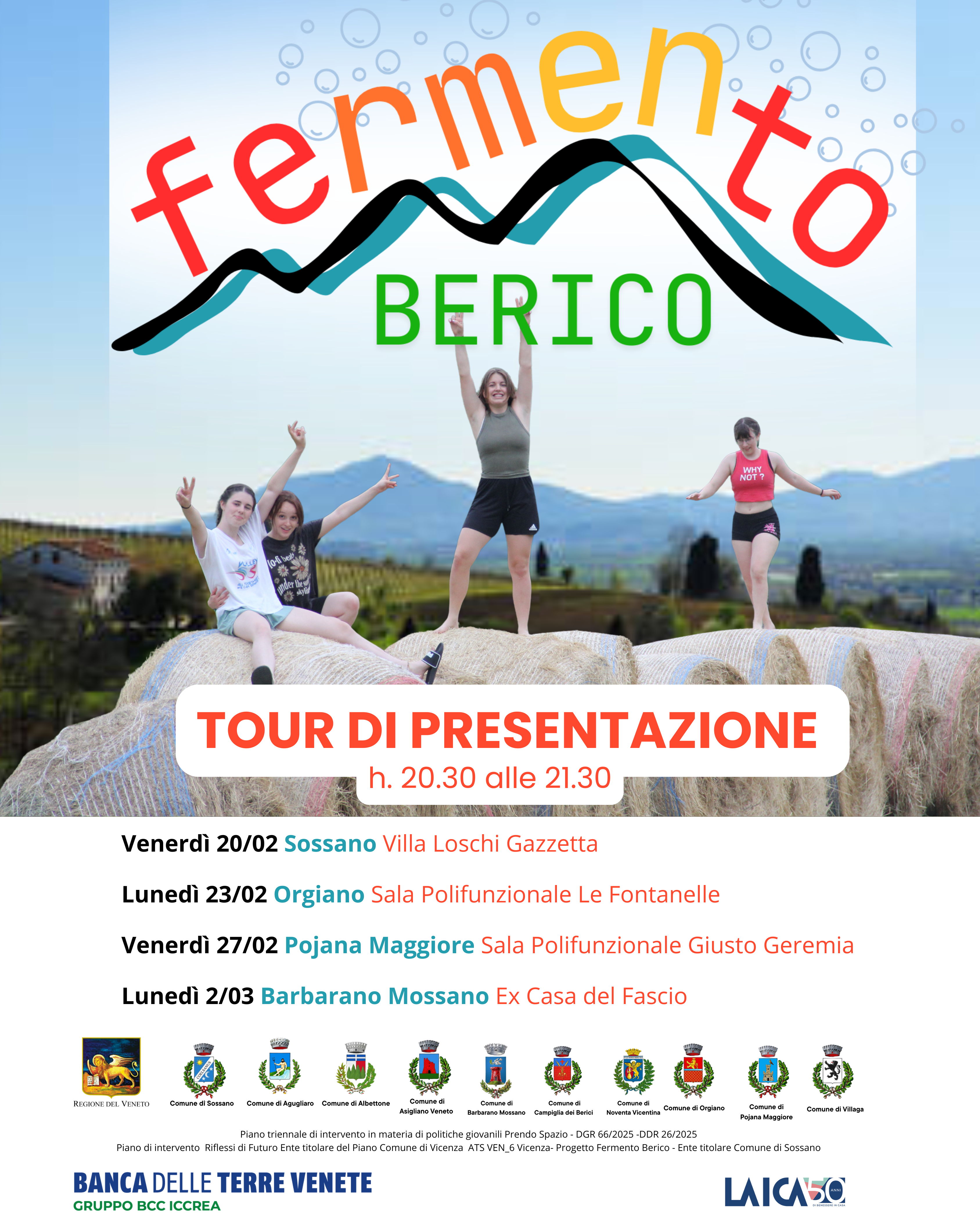 Il Comune di Sossano, in collaborazione con i Comuni di Asigliano Veneto, Agugliaro, Albettone, Barbarano Mossano, Campiglia dei Berici, Noventa Vicentina, Orgiano, Pojana Maggiore e Villaga, annuncia l’avvio di "Fermento Berico". L'iniziativa è rivolta ai giovani di età compresa tra i 14 e i 22 anni residenti nei territori coinvolti, offrendo loro un’esperienza unica di cittadinanza attiva e crescita personale che si svilupperà da aprile a ottobre 2026.
